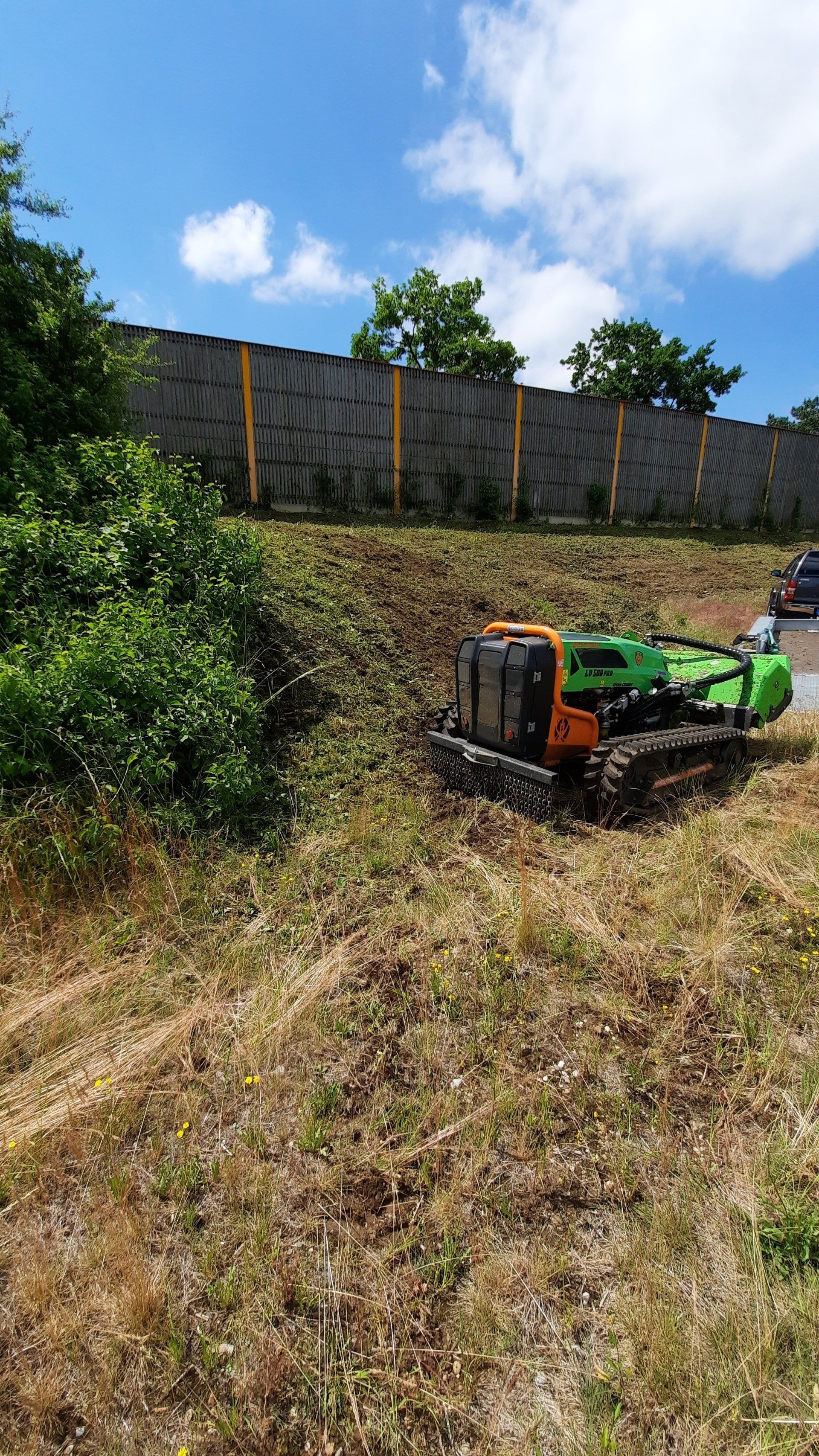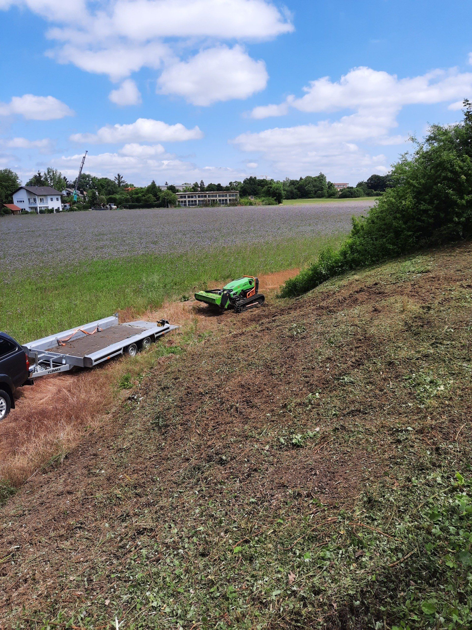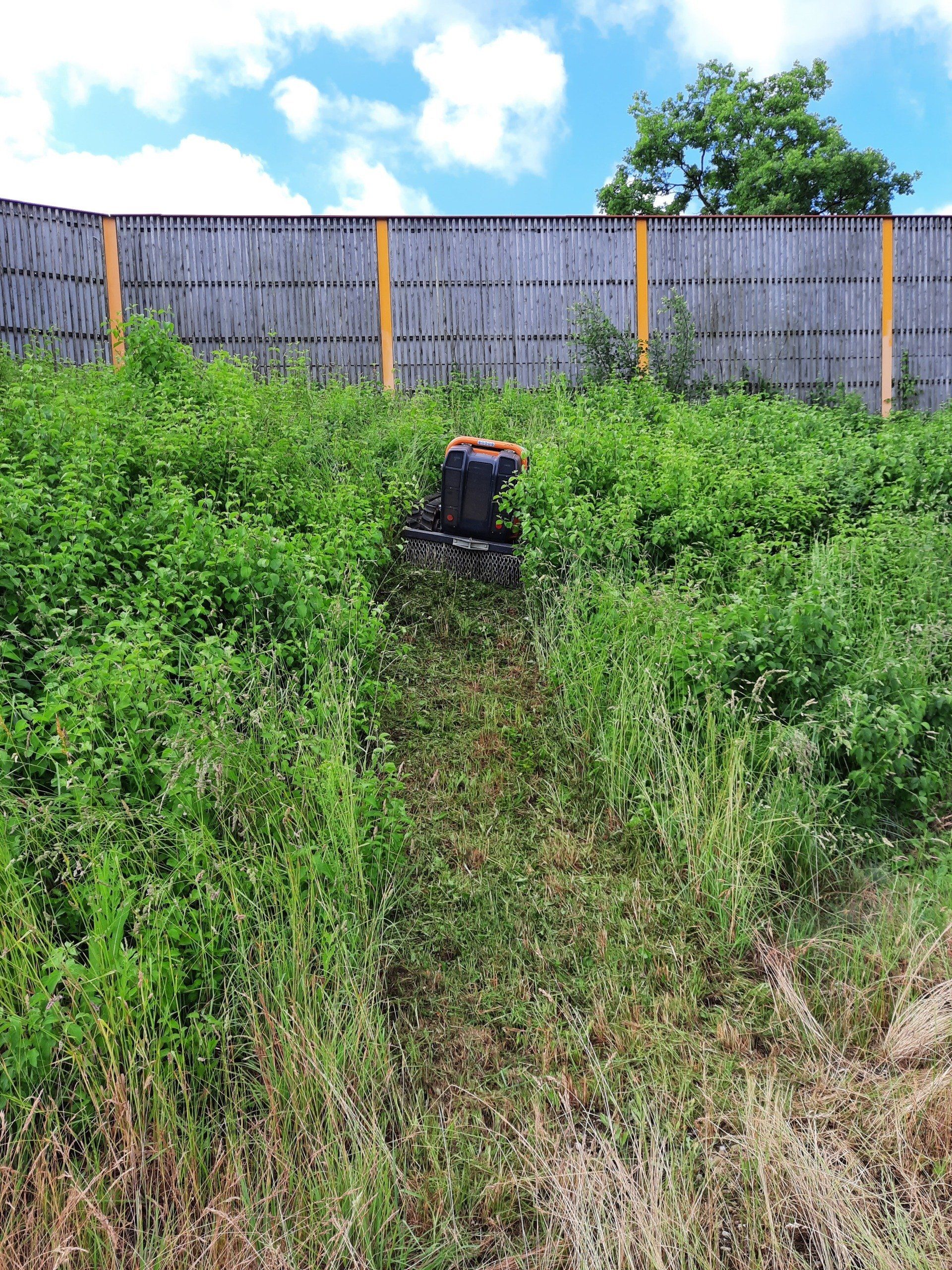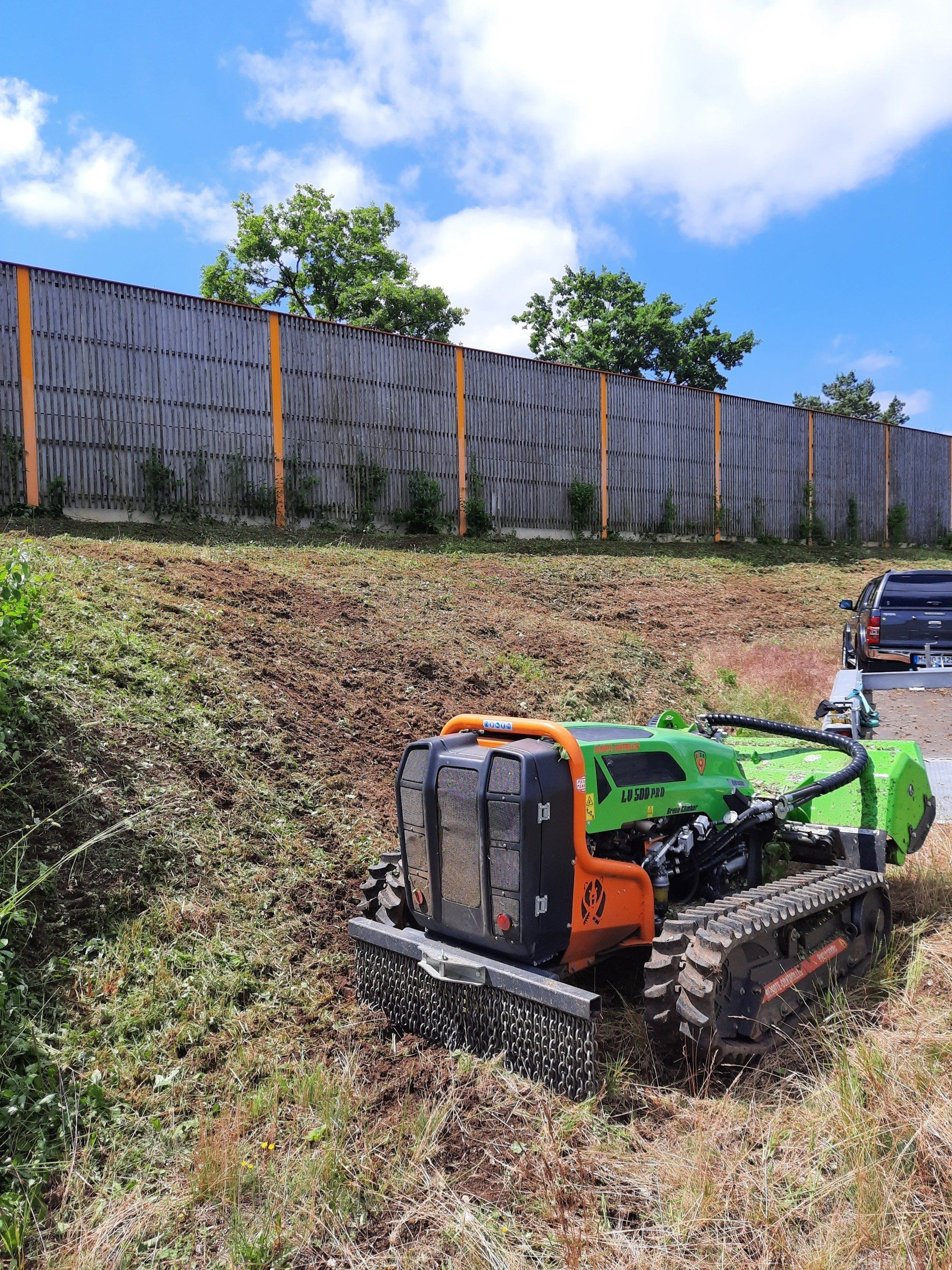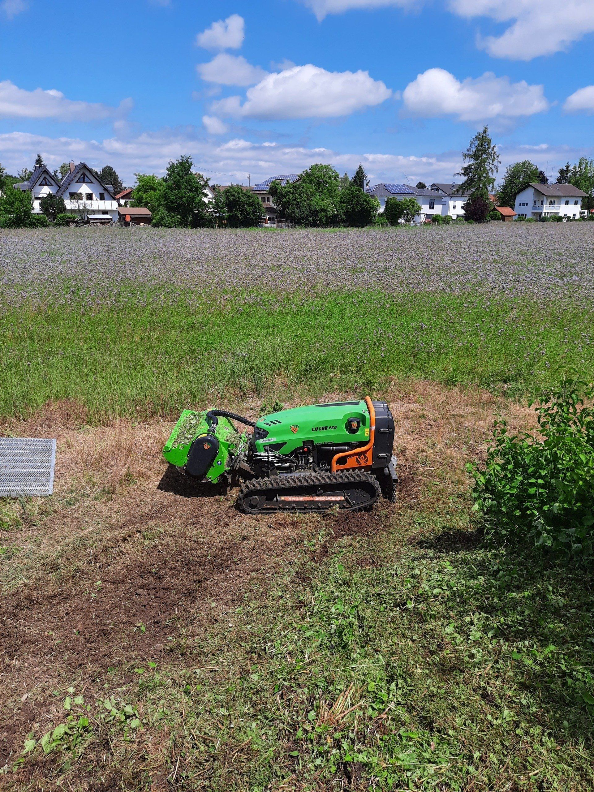 Unsere 49 PS starke funkgesteuerte Raupe der Firma MDB besticht durch ihre vielseitigen Einsatzmöglichkeiten in der Landschaftspflege.